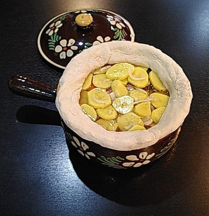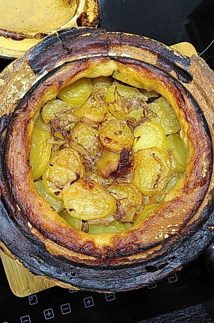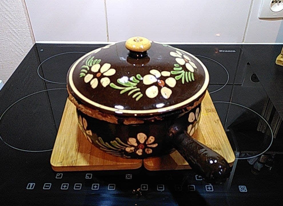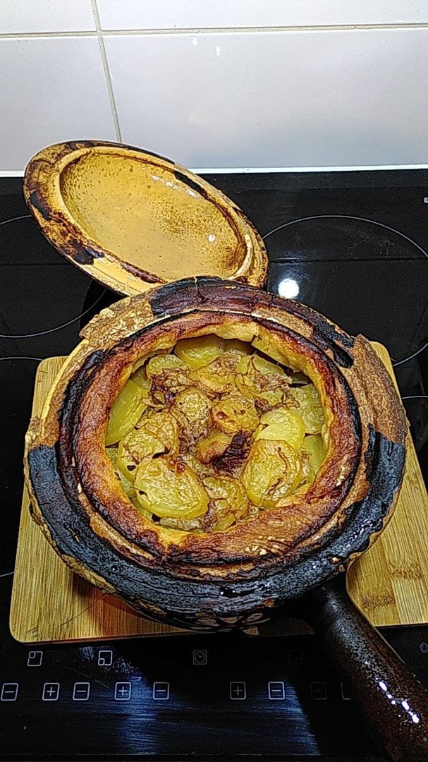 Es ist ein traditionelles Gericht auf der Grundlage von eingelegtem Fleisch und Gemüse, das Hausfrauen vor dem Weg auf die Felder zubereiteten und im Bäckerofen - dem damals einzigen Ofen im Dorf - backten. Die Frauen nutzten so die Restwärme des Dorf-Ofens zum Kochen, wenn ihnen die Arbeit wenig Zeit zum Kochen ließ.